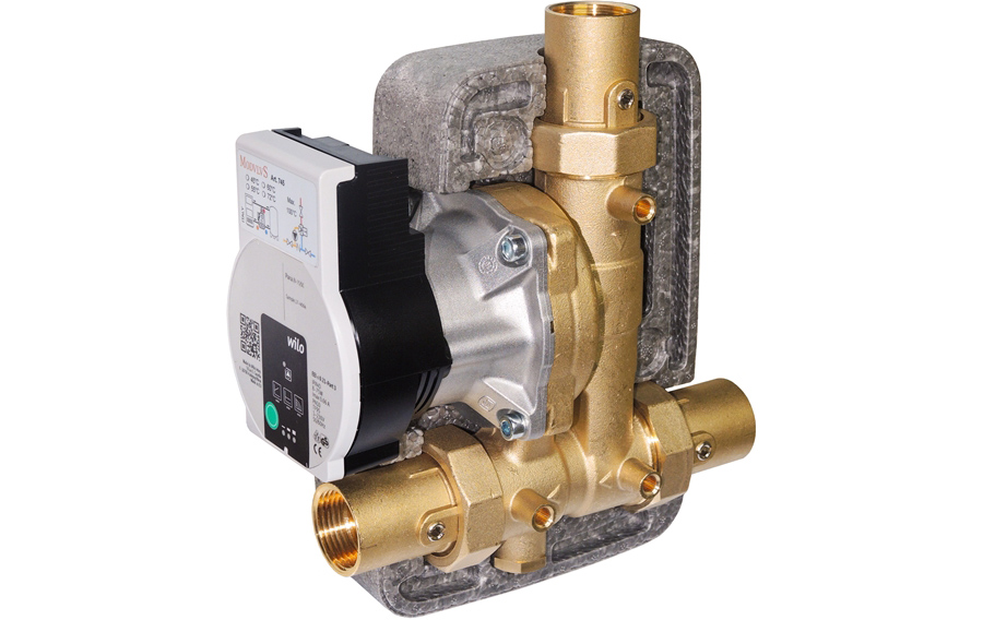 Antikondenzační recirkulační čerpadlová jednotka umožňuje přímé připojení zdroje tepla na tuhá paliva k otopné soustavě nebo k vyrovnávací nádrži bez pomoci dalších zařízení. Jednotka ve skutečnosti uzavírá oběhové čerpadlo, antikondenzační termický ventil, vylučovatelný klapkový ventil s přirozenou cirkulací, uzavírací ventily a teploměry v kompaktní a elegantní izolaci. Automaticky upravuje teplotu vody vracející se do generátoru na kalibrační hodnotu zvoleného termostatu.