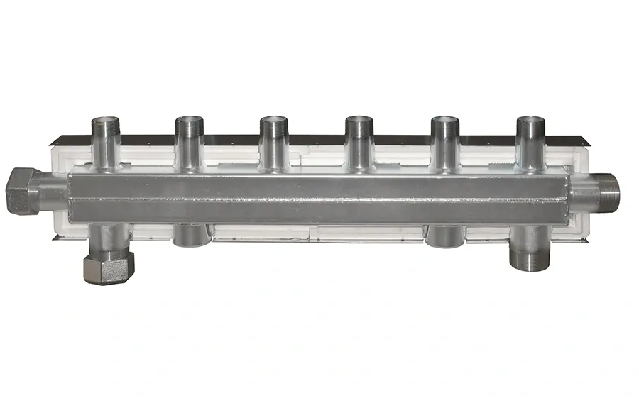 Izolovaný rozdělovač pro výkony do 165 kW (s teplotním rozdílem ∆T = 20 K v primárním okruhu). Dvojité připojení s okružní jízdou umožňuje instalaci hydraulického odlučovače lhostejně vpravo nebo vlevo: tím se zabrání nutnosti otáčet rozdělovačem obrácením přívodního a zpětného potrubí směrem k uživateli. Součástí balení jsou také dvě pozinkované litinové zátky s vnitřním závitem 2", které jsou nezbytné k izolaci dvou nepoužitých přípojek rozdělovače.