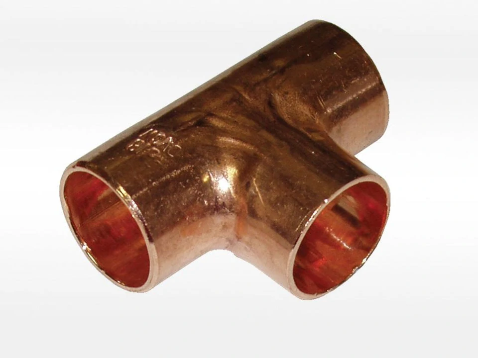 Měděný T-kus jednoznačný, pro spojování měděných trubek pájením.